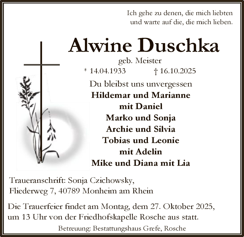 Hier finden Sie alle Traueranzeigen aus der Zeitung, die bisher für Alwine Duschka erschienen sind. Weitere Traueranzeigen, die in der Zeitung erscheinen, werden hier ebenfalls aufgelistet