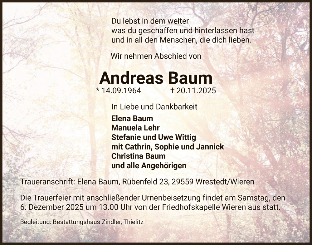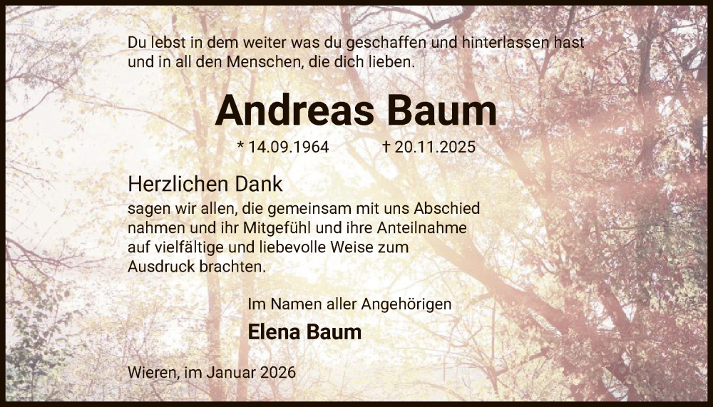 Hier finden Sie alle Traueranzeigen aus der Zeitung, die bisher für Andreas Baum erschienen sind. Weitere Traueranzeigen, die in der Zeitung erscheinen, werden hier ebenfalls aufgelistet