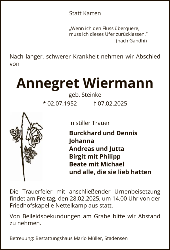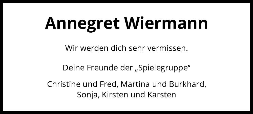 Hier finden Sie alle Traueranzeigen aus der Zeitung, die bisher für Annegret Wiermann erschienen sind. Weitere Traueranzeigen, die in der Zeitung erscheinen, werden hier ebenfalls aufgelistet