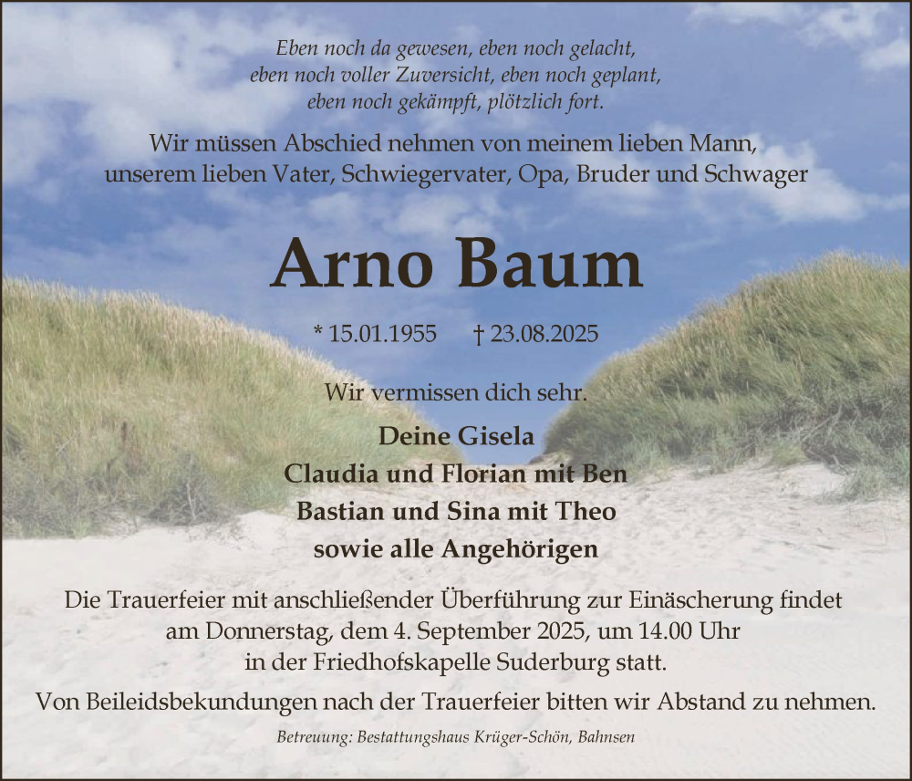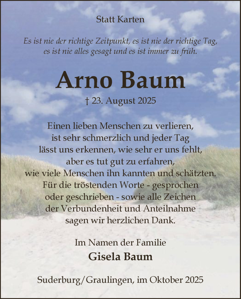 Hier finden Sie alle Traueranzeigen aus der Zeitung, die bisher für Arno Baum erschienen sind. Weitere Traueranzeigen, die in der Zeitung erscheinen, werden hier ebenfalls aufgelistet
