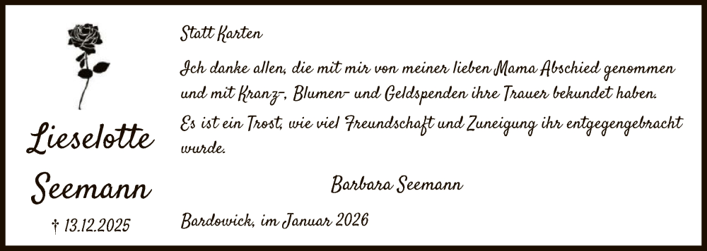 Hier finden Sie alle Traueranzeigen aus der Zeitung, die bisher für Barbara Seemann erschienen sind. Weitere Traueranzeigen, die in der Zeitung erscheinen, werden hier ebenfalls aufgelistet