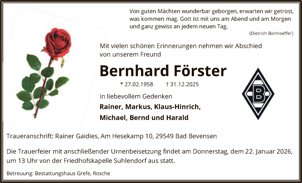 Hier finden Sie alle Traueranzeigen aus der Zeitung, die bisher für Bernhard Förster erschienen sind. Weitere Traueranzeigen, die in der Zeitung erscheinen, werden hier ebenfalls aufgelistet