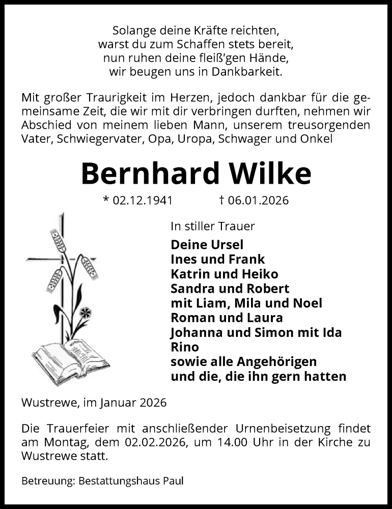 Hier finden Sie alle Traueranzeigen aus der Zeitung, die bisher für Bernhard Wilke erschienen sind. Weitere Traueranzeigen, die in der Zeitung erscheinen, werden hier ebenfalls aufgelistet