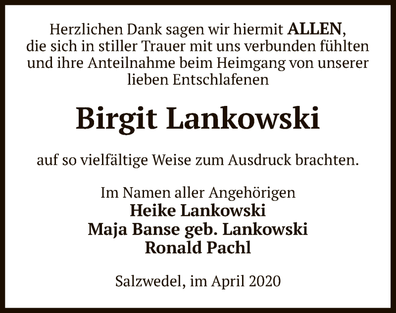 Hier finden Sie alle Traueranzeigen aus der Zeitung, die bisher für Birgit Lankowski erschienen sind. Weitere Traueranzeigen, die in der Zeitung erscheinen, werden hier ebenfalls aufgelistet