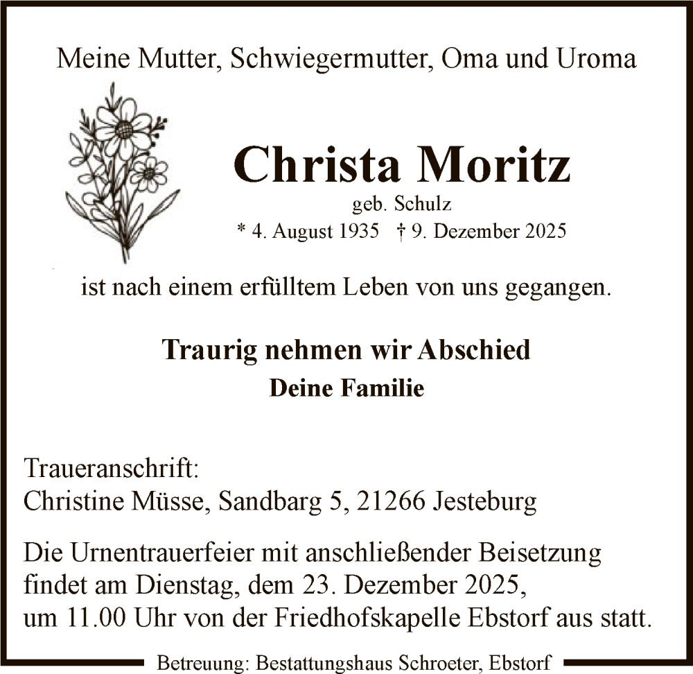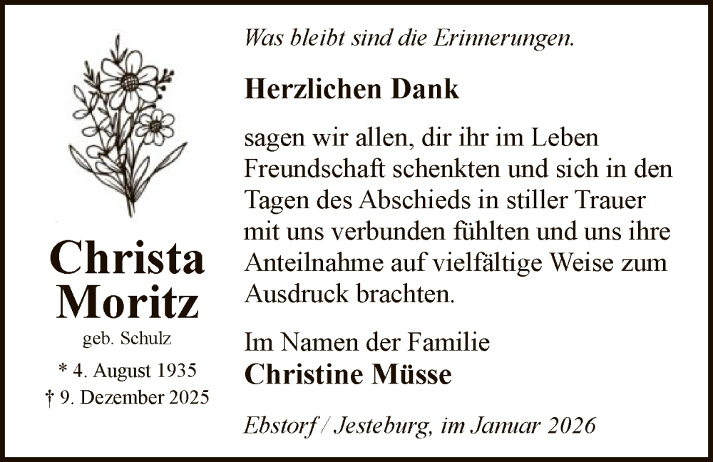 Hier finden Sie alle Traueranzeigen aus der Zeitung, die bisher für Christa Moritz erschienen sind. Weitere Traueranzeigen, die in der Zeitung erscheinen, werden hier ebenfalls aufgelistet