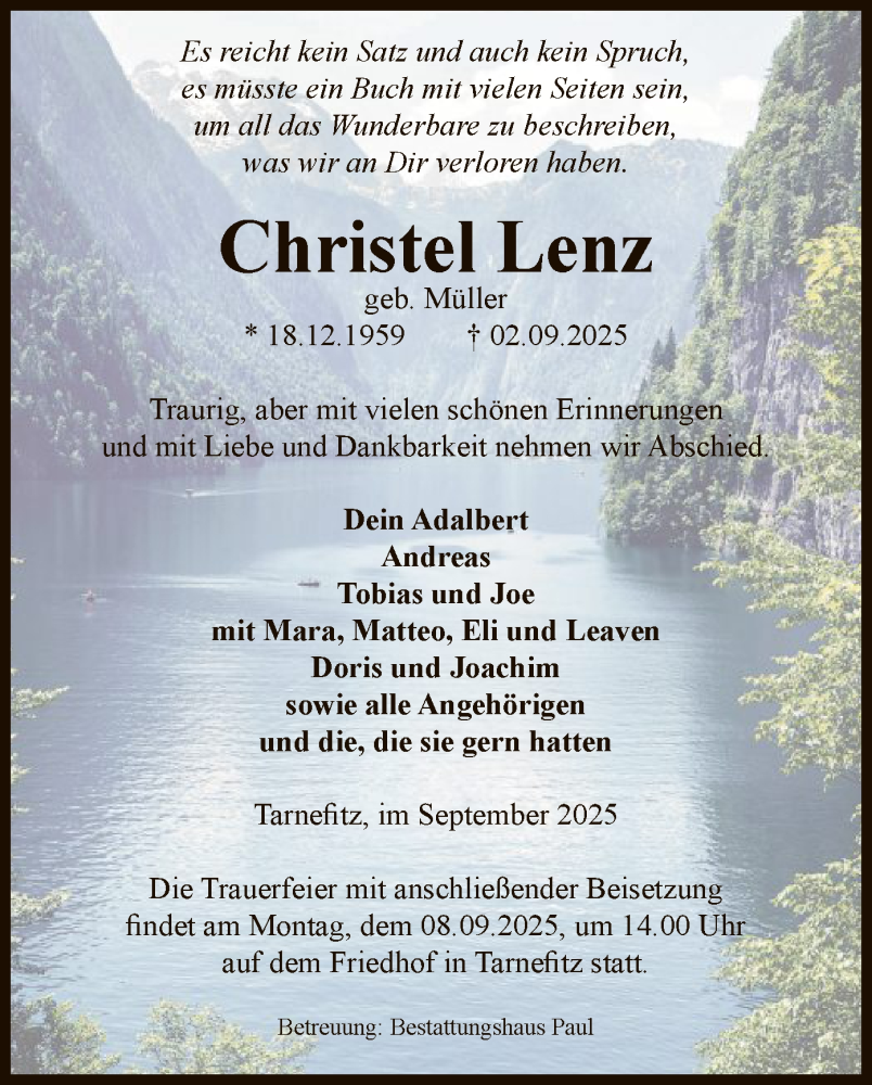Hier finden Sie alle Traueranzeigen aus der Zeitung, die bisher für Christel Lenz erschienen sind. Weitere Traueranzeigen, die in der Zeitung erscheinen, werden hier ebenfalls aufgelistet