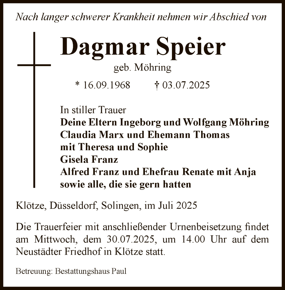 Hier finden Sie alle Traueranzeigen aus der Zeitung, die bisher für Dagmar Speier erschienen sind. Weitere Traueranzeigen, die in der Zeitung erscheinen, werden hier ebenfalls aufgelistet