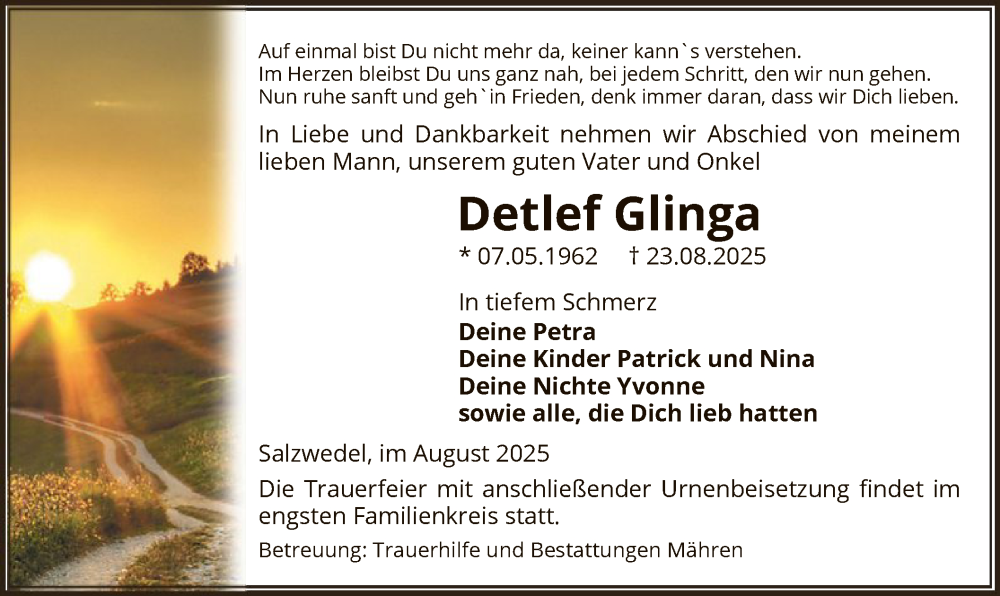 Hier finden Sie alle Traueranzeigen aus der Zeitung, die bisher für Detlef Glinga erschienen sind. Weitere Traueranzeigen, die in der Zeitung erscheinen, werden hier ebenfalls aufgelistet