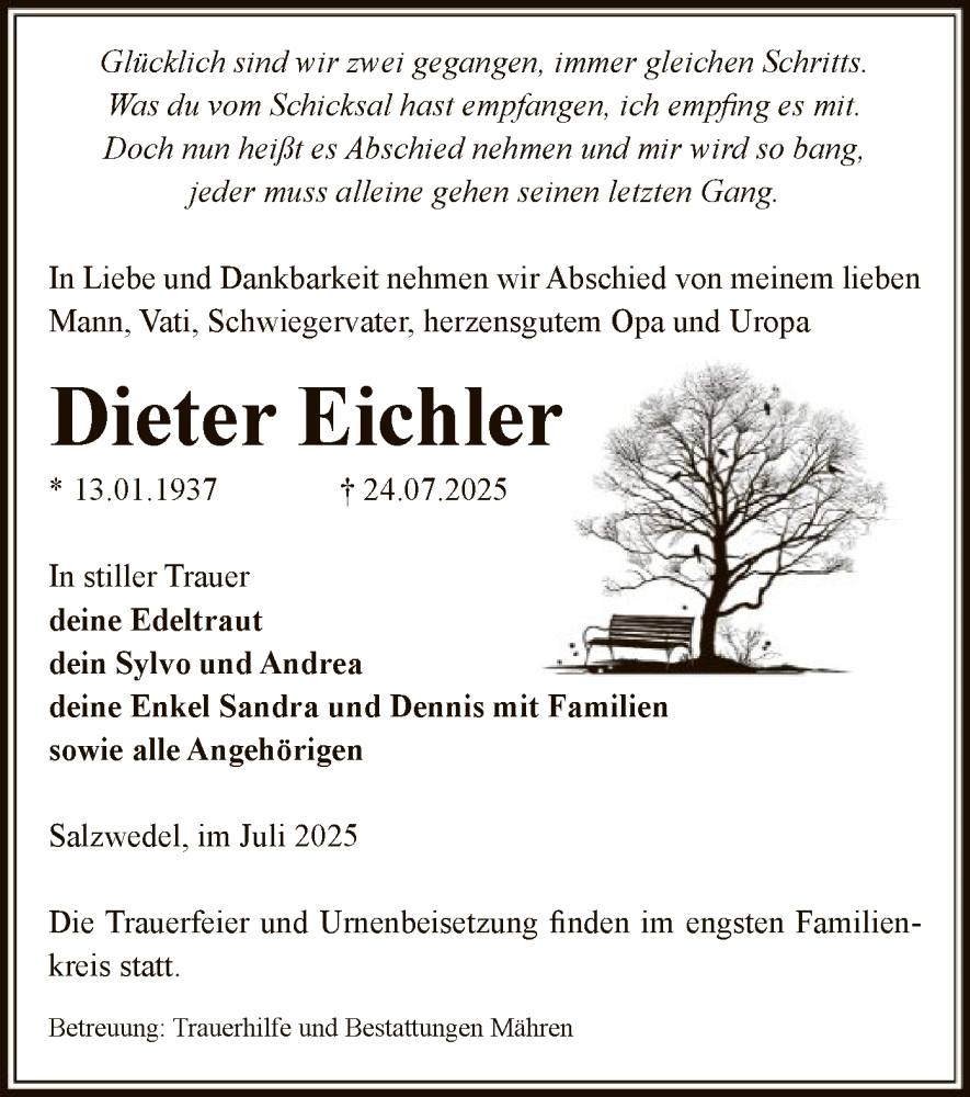 Hier finden Sie alle Traueranzeigen aus der Zeitung, die bisher für Dieter Eichler erschienen sind. Weitere Traueranzeigen, die in der Zeitung erscheinen, werden hier ebenfalls aufgelistet