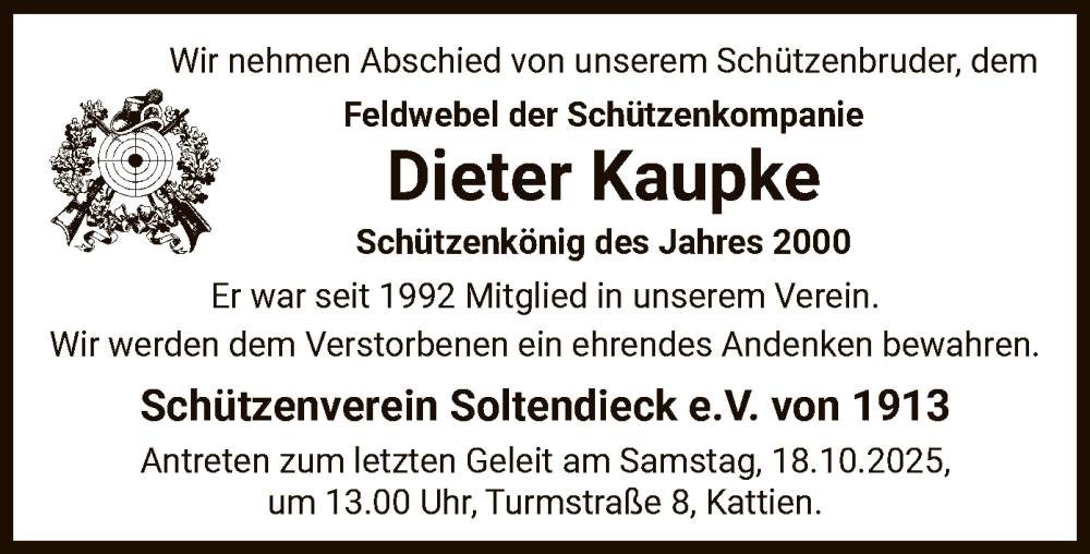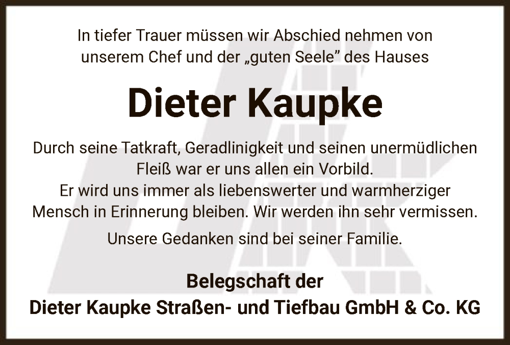 Hier finden Sie alle Traueranzeigen aus der Zeitung, die bisher für Dieter Kaupke erschienen sind. Weitere Traueranzeigen, die in der Zeitung erscheinen, werden hier ebenfalls aufgelistet