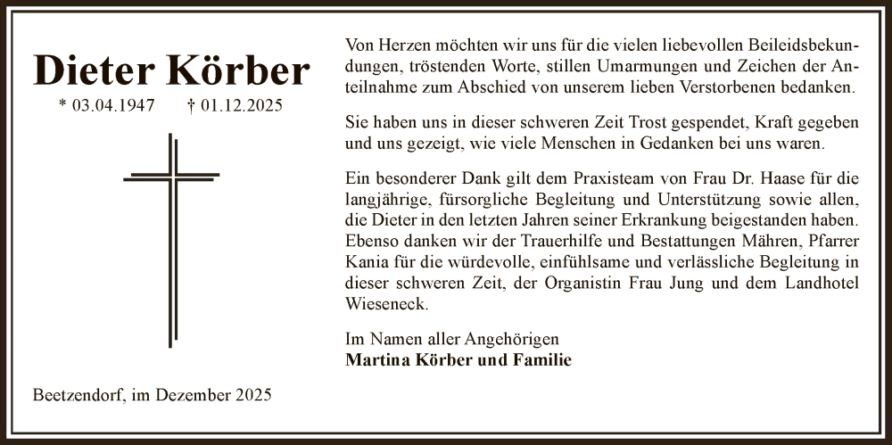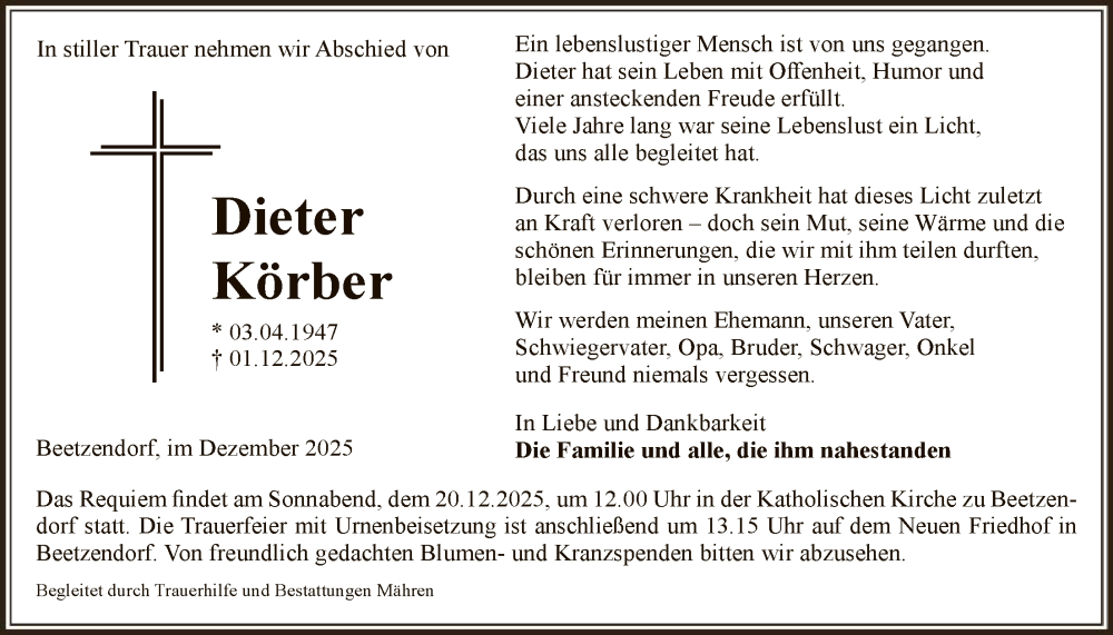 Hier finden Sie alle Traueranzeigen aus der Zeitung, die bisher für Dieter Körber erschienen sind. Weitere Traueranzeigen, die in der Zeitung erscheinen, werden hier ebenfalls aufgelistet