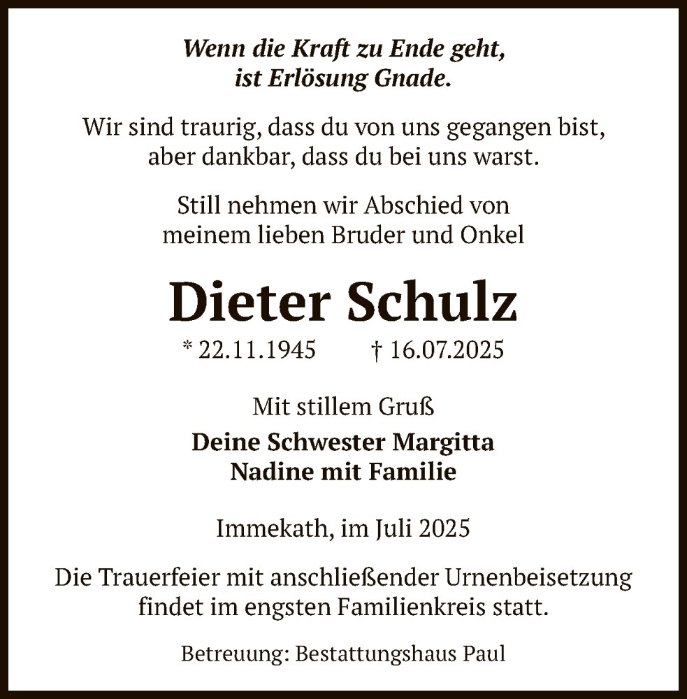 Hier finden Sie alle Traueranzeigen aus der Zeitung, die bisher für Dieter Schulz erschienen sind. Weitere Traueranzeigen, die in der Zeitung erscheinen, werden hier ebenfalls aufgelistet