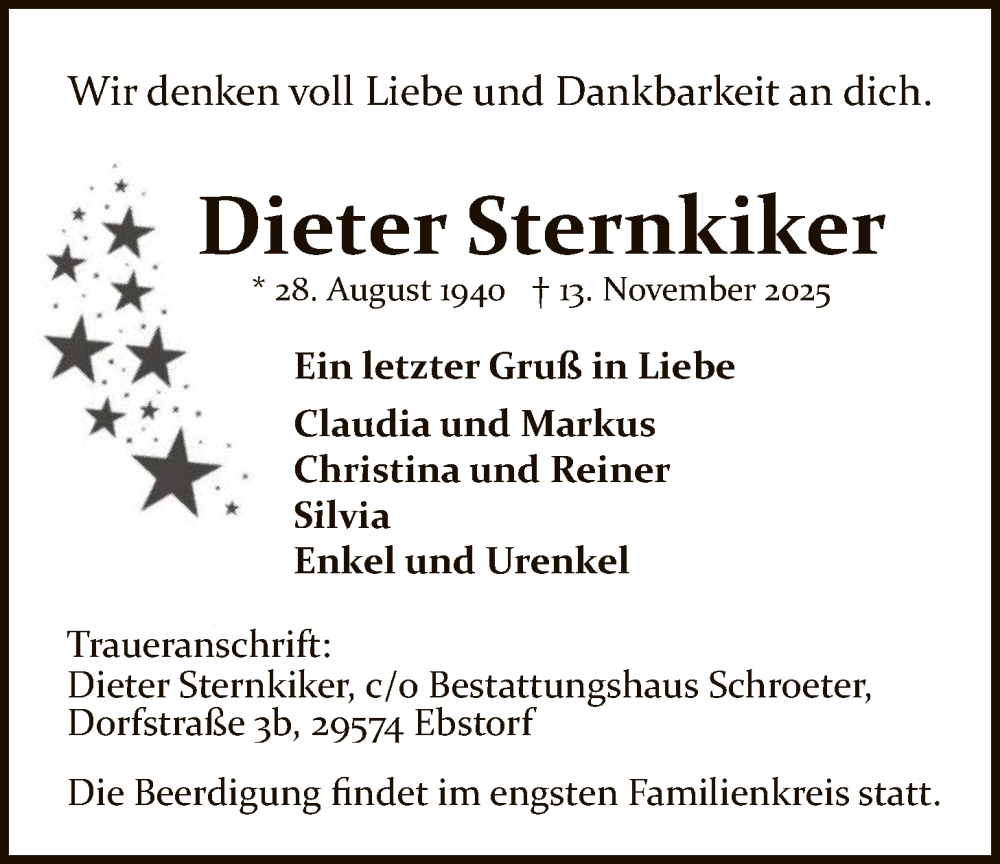 Hier finden Sie alle Traueranzeigen aus der Zeitung, die bisher für Dieter Sternkiker erschienen sind. Weitere Traueranzeigen, die in der Zeitung erscheinen, werden hier ebenfalls aufgelistet
