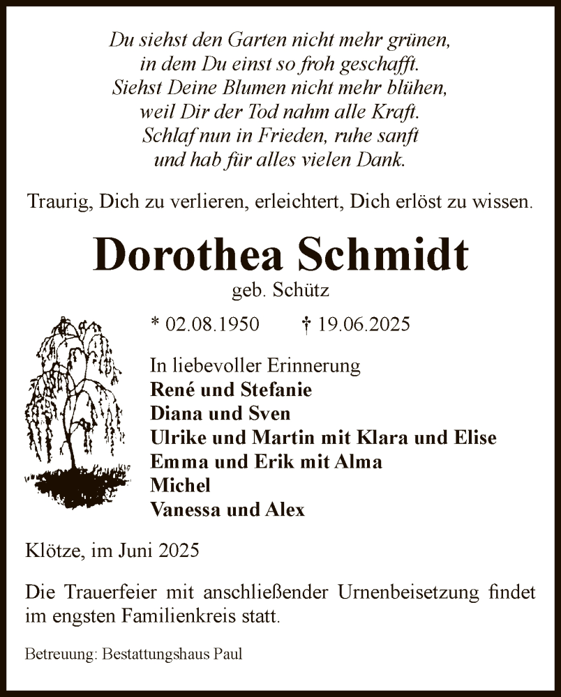 Hier finden Sie alle Traueranzeigen aus der Zeitung, die bisher für Dorothea Schmidt erschienen sind. Weitere Traueranzeigen, die in der Zeitung erscheinen, werden hier ebenfalls aufgelistet