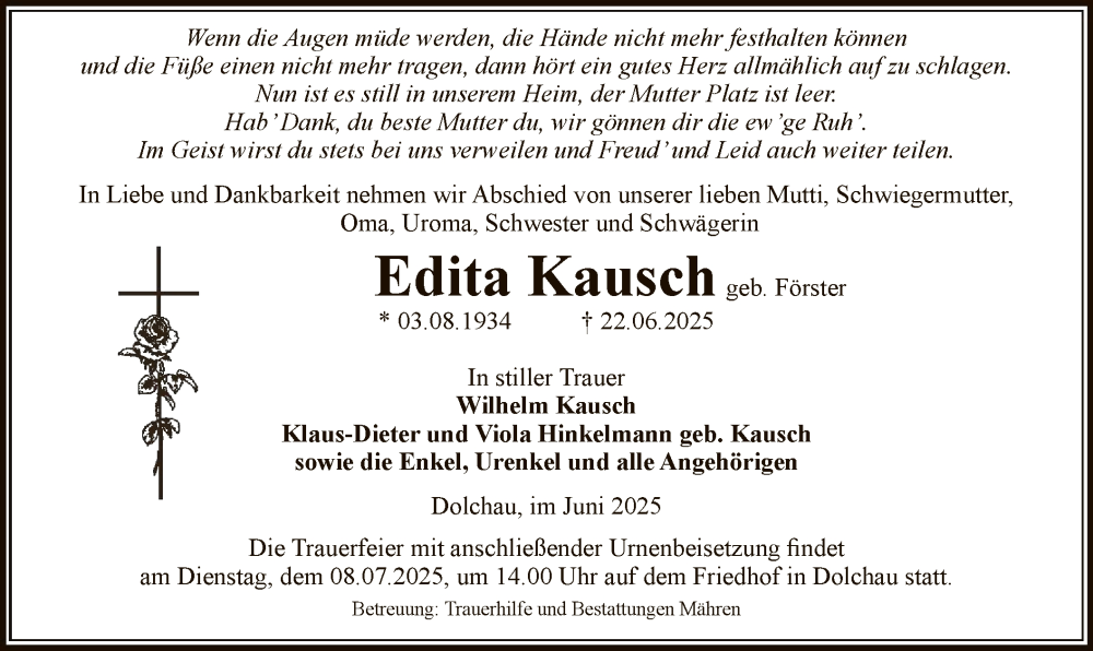 Hier finden Sie alle Traueranzeigen aus der Zeitung, die bisher für Edita Kausch erschienen sind. Weitere Traueranzeigen, die in der Zeitung erscheinen, werden hier ebenfalls aufgelistet