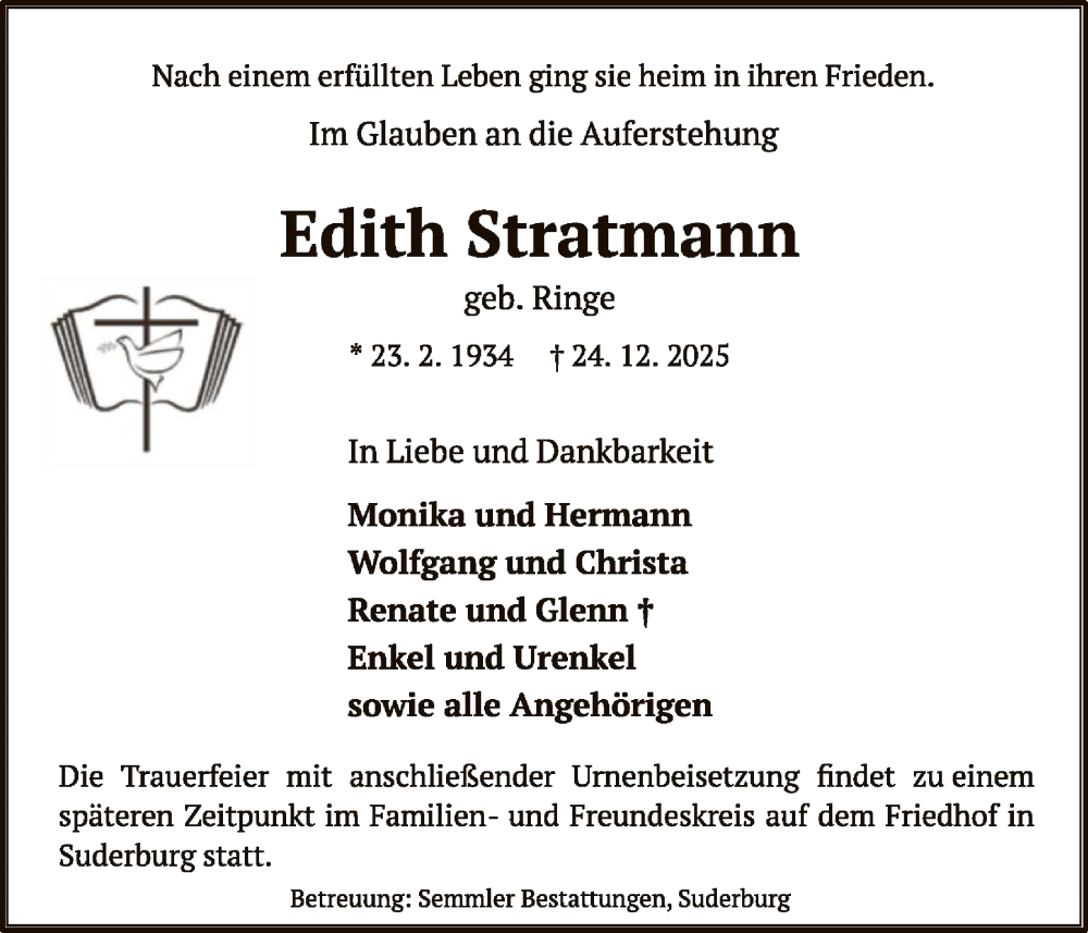 Hier finden Sie alle Traueranzeigen aus der Zeitung, die bisher für Edith Stratmann erschienen sind. Weitere Traueranzeigen, die in der Zeitung erscheinen, werden hier ebenfalls aufgelistet