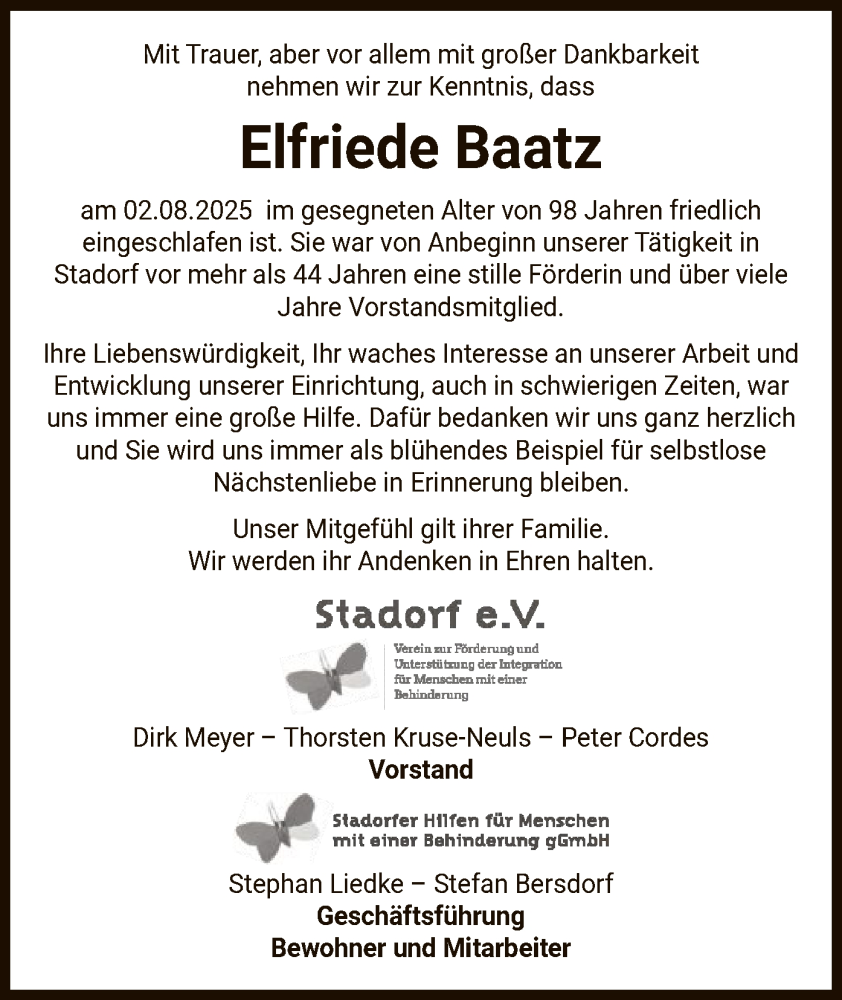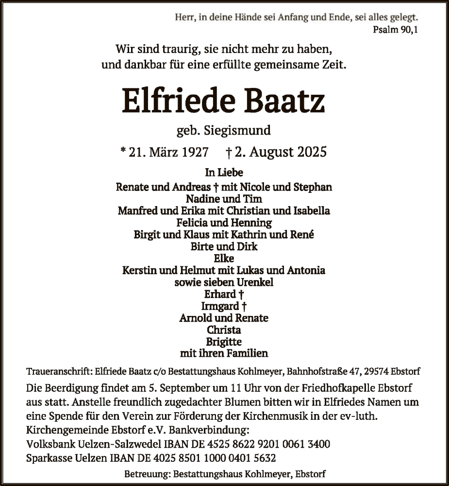 Hier finden Sie alle Traueranzeigen aus der Zeitung, die bisher für Elfriede Baatz erschienen sind. Weitere Traueranzeigen, die in der Zeitung erscheinen, werden hier ebenfalls aufgelistet