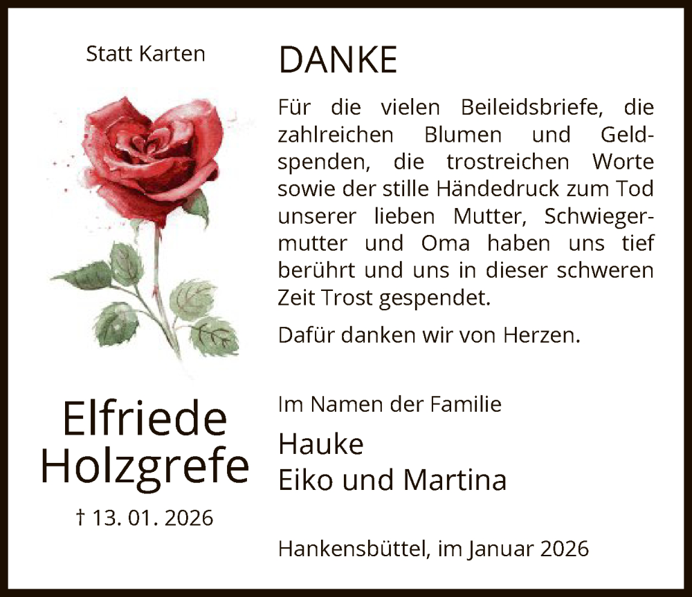 Hier finden Sie alle Traueranzeigen aus der Zeitung, die bisher für Elfriede Holzgrefe erschienen sind. Weitere Traueranzeigen, die in der Zeitung erscheinen, werden hier ebenfalls aufgelistet
