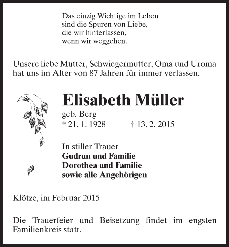 Hier finden Sie alle Traueranzeigen aus der Zeitung, die bisher für Elisabeth Müller erschienen sind. Weitere Traueranzeigen, die in der Zeitung erscheinen, werden hier ebenfalls aufgelistet