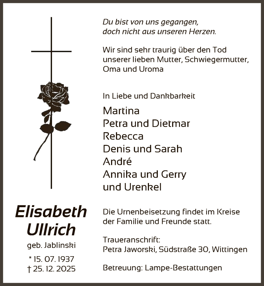 Hier finden Sie alle Traueranzeigen aus der Zeitung, die bisher für Elisabeth Ullrich erschienen sind. Weitere Traueranzeigen, die in der Zeitung erscheinen, werden hier ebenfalls aufgelistet