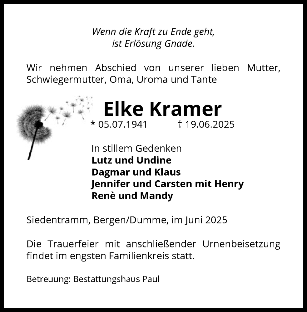 Hier finden Sie alle Traueranzeigen aus der Zeitung, die bisher für Elke Kramer erschienen sind. Weitere Traueranzeigen, die in der Zeitung erscheinen, werden hier ebenfalls aufgelistet