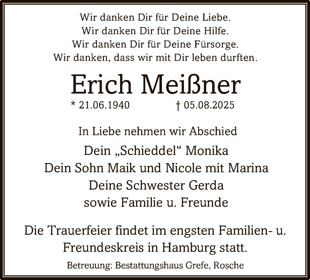 Hier finden Sie alle Traueranzeigen aus der Zeitung, die bisher für Erich Meißner erschienen sind. Weitere Traueranzeigen, die in der Zeitung erscheinen, werden hier ebenfalls aufgelistet