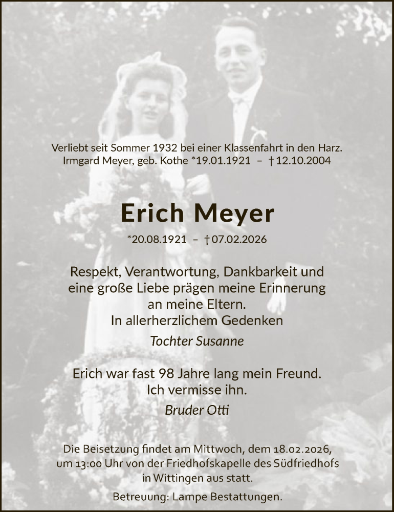 Hier finden Sie alle Traueranzeigen aus der Zeitung, die bisher für Erich Meyer erschienen sind. Weitere Traueranzeigen, die in der Zeitung erscheinen, werden hier ebenfalls aufgelistet