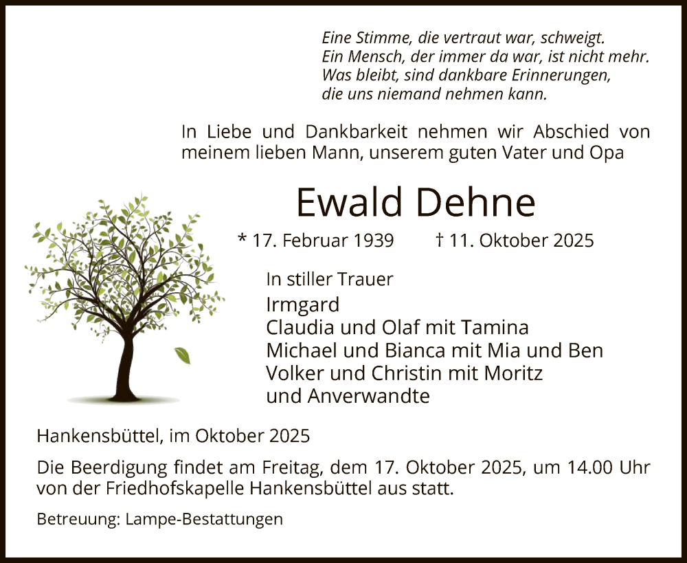 Hier finden Sie alle Traueranzeigen aus der Zeitung, die bisher für Ewald Dehne erschienen sind. Weitere Traueranzeigen, die in der Zeitung erscheinen, werden hier ebenfalls aufgelistet
