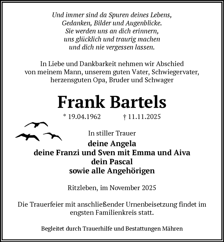 Hier finden Sie alle Traueranzeigen aus der Zeitung, die bisher für Frank Bartels erschienen sind. Weitere Traueranzeigen, die in der Zeitung erscheinen, werden hier ebenfalls aufgelistet