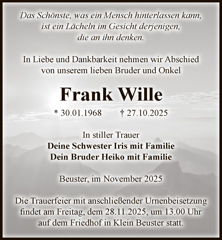 Hier finden Sie alle Traueranzeigen aus der Zeitung, die bisher für Frank Wille erschienen sind. Weitere Traueranzeigen, die in der Zeitung erscheinen, werden hier ebenfalls aufgelistet