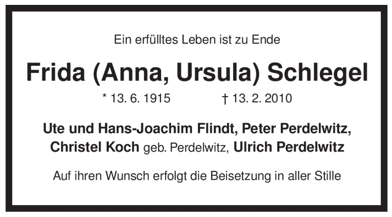 Hier finden Sie alle Traueranzeigen aus der Zeitung, die bisher für Frida Schlegel erschienen sind. Weitere Traueranzeigen, die in der Zeitung erscheinen, werden hier ebenfalls aufgelistet