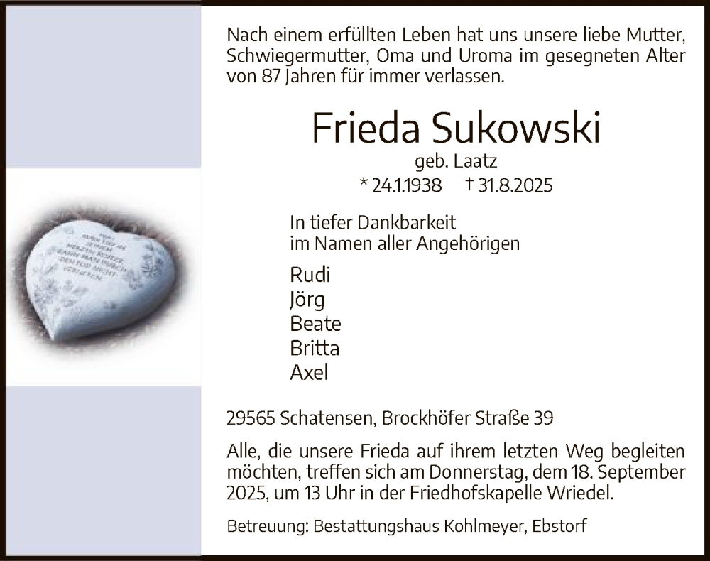 Hier finden Sie alle Traueranzeigen aus der Zeitung, die bisher für Frieda Sukowski erschienen sind. Weitere Traueranzeigen, die in der Zeitung erscheinen, werden hier ebenfalls aufgelistet