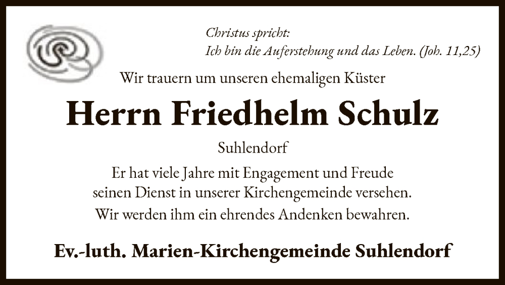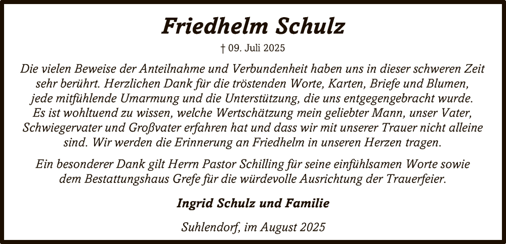 Hier finden Sie alle Traueranzeigen aus der Zeitung, die bisher für Friedhelm Schulz erschienen sind. Weitere Traueranzeigen, die in der Zeitung erscheinen, werden hier ebenfalls aufgelistet