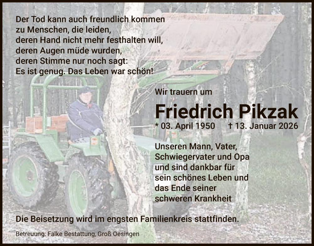 Hier finden Sie alle Traueranzeigen aus der Zeitung, die bisher für Friedrich Pikzak erschienen sind. Weitere Traueranzeigen, die in der Zeitung erscheinen, werden hier ebenfalls aufgelistet