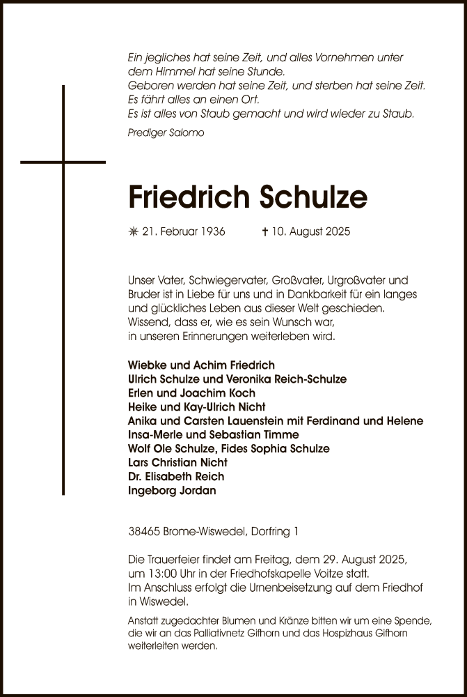 Hier finden Sie alle Traueranzeigen aus der Zeitung, die bisher für Friedrich Schulze erschienen sind. Weitere Traueranzeigen, die in der Zeitung erscheinen, werden hier ebenfalls aufgelistet