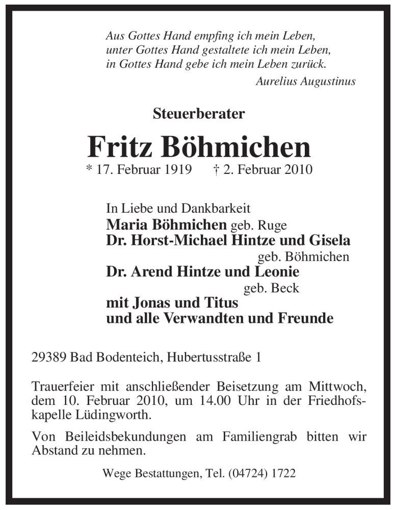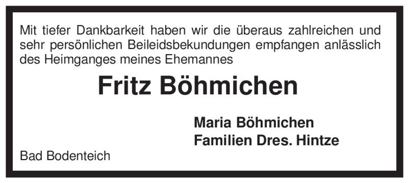 Hier finden Sie alle Traueranzeigen aus der Zeitung, die bisher für Fritz Böhmichen erschienen sind. Weitere Traueranzeigen, die in der Zeitung erscheinen, werden hier ebenfalls aufgelistet