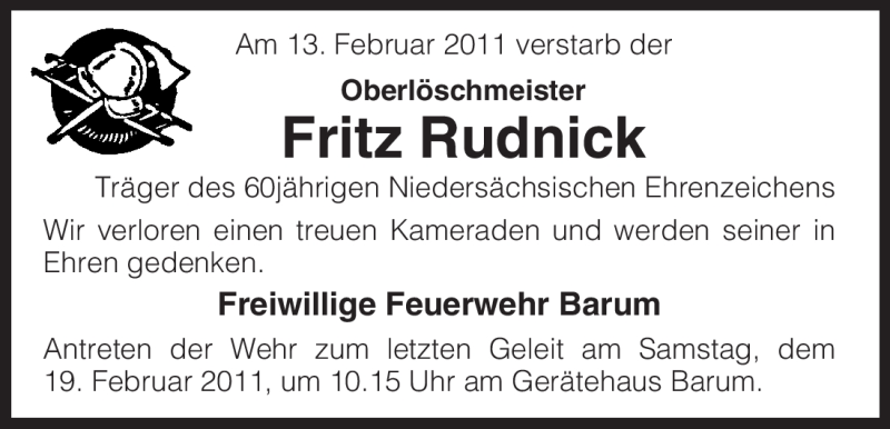 Hier finden Sie alle Traueranzeigen aus der Zeitung, die bisher für Fritz Rudnick erschienen sind. Weitere Traueranzeigen, die in der Zeitung erscheinen, werden hier ebenfalls aufgelistet