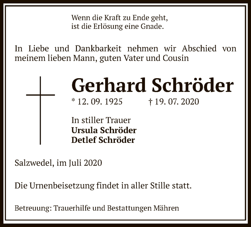 Hier finden Sie alle Traueranzeigen aus der Zeitung, die bisher für Gerhard Schröder erschienen sind. Weitere Traueranzeigen, die in der Zeitung erscheinen, werden hier ebenfalls aufgelistet