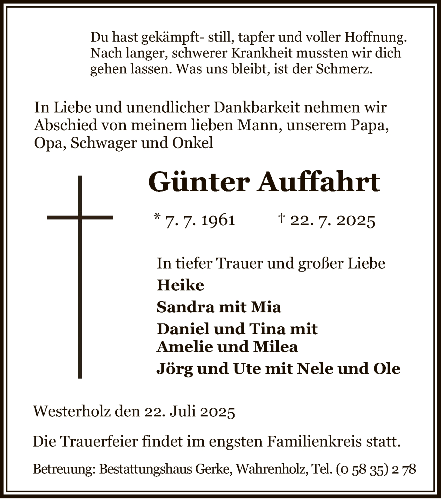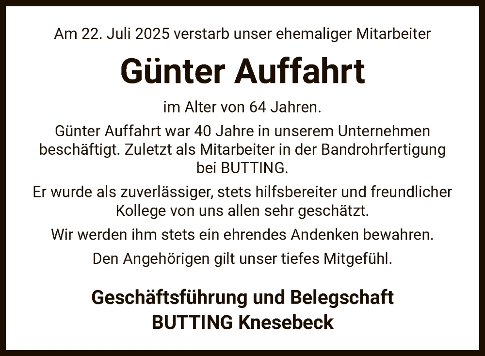 Hier finden Sie alle Traueranzeigen aus der Zeitung, die bisher für Günter Auffahrt erschienen sind. Weitere Traueranzeigen, die in der Zeitung erscheinen, werden hier ebenfalls aufgelistet