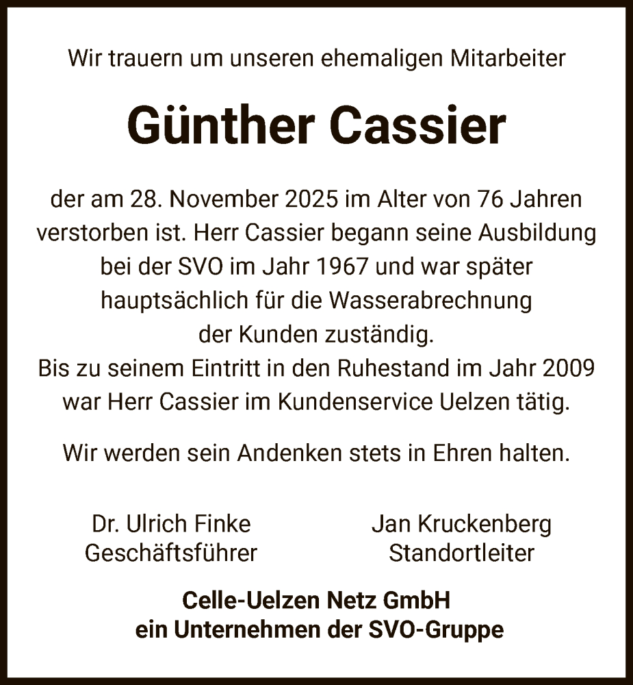 Hier finden Sie alle Traueranzeigen aus der Zeitung, die bisher für Günther Cassier erschienen sind. Weitere Traueranzeigen, die in der Zeitung erscheinen, werden hier ebenfalls aufgelistet