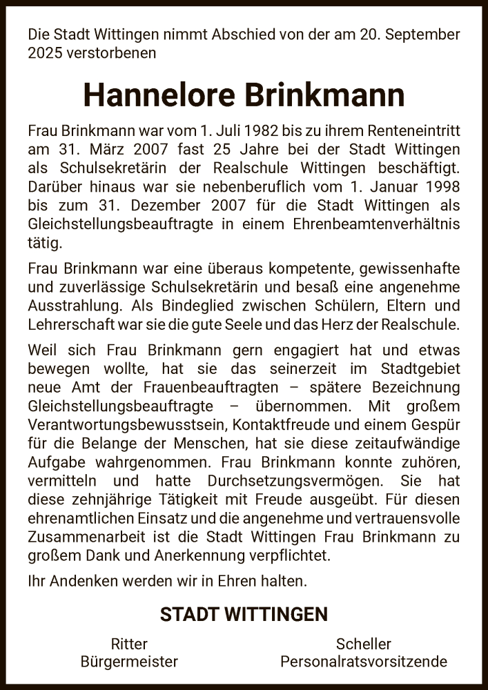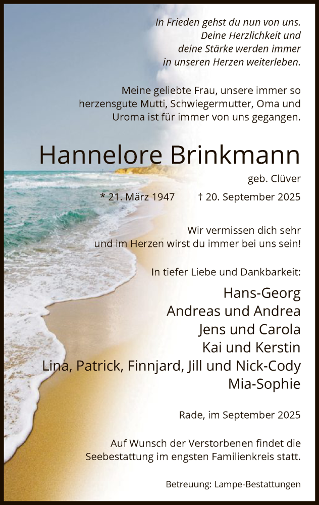 Hier finden Sie alle Traueranzeigen aus der Zeitung, die bisher für Hannelore Brinkmann erschienen sind. Weitere Traueranzeigen, die in der Zeitung erscheinen, werden hier ebenfalls aufgelistet