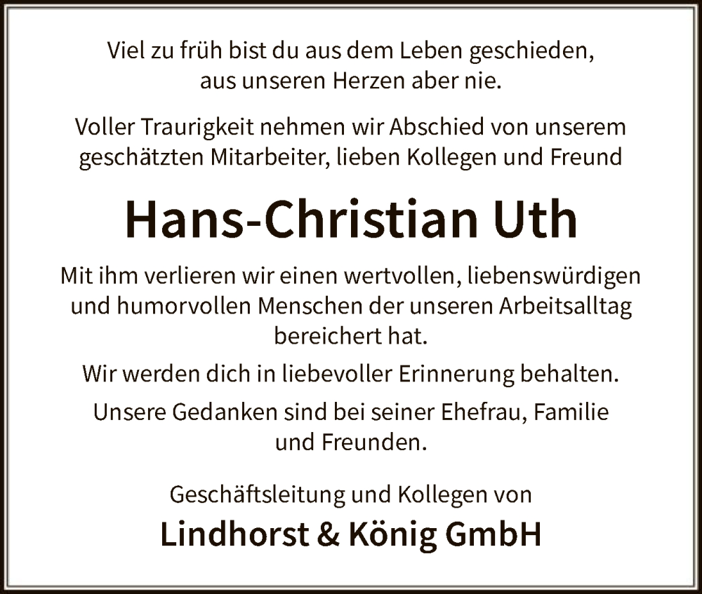 Hier finden Sie alle Traueranzeigen aus der Zeitung, die bisher für Hans-Christian Uth erschienen sind. Weitere Traueranzeigen, die in der Zeitung erscheinen, werden hier ebenfalls aufgelistet