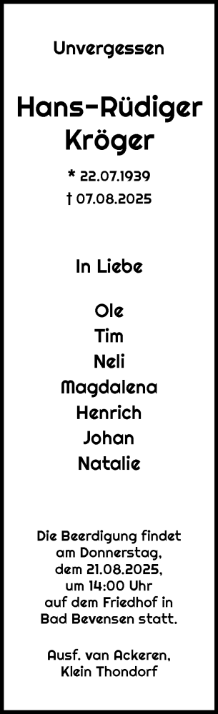 Hier finden Sie alle Traueranzeigen aus der Zeitung, die bisher für Hans-Rüdiger Kröger erschienen sind. Weitere Traueranzeigen, die in der Zeitung erscheinen, werden hier ebenfalls aufgelistet