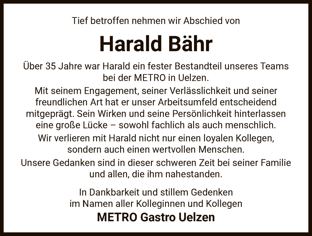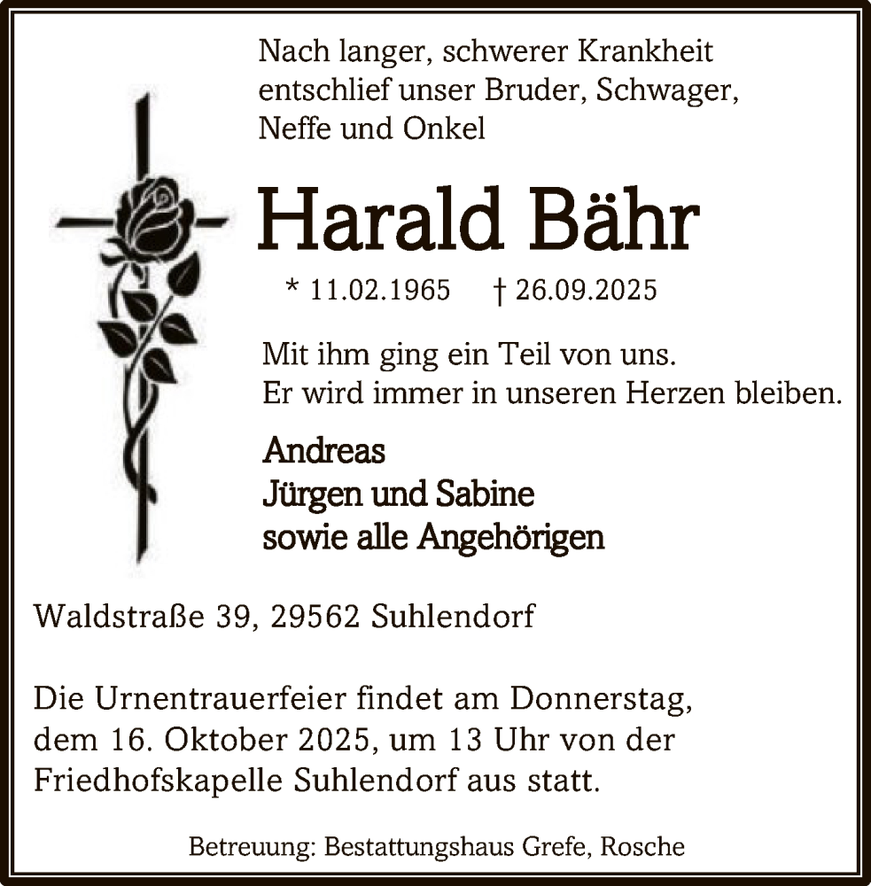 Hier finden Sie alle Traueranzeigen aus der Zeitung, die bisher für Harald Bähr erschienen sind. Weitere Traueranzeigen, die in der Zeitung erscheinen, werden hier ebenfalls aufgelistet