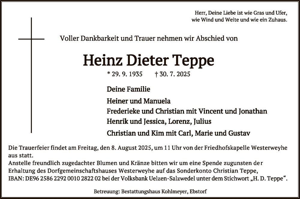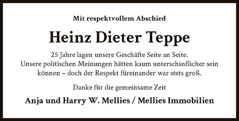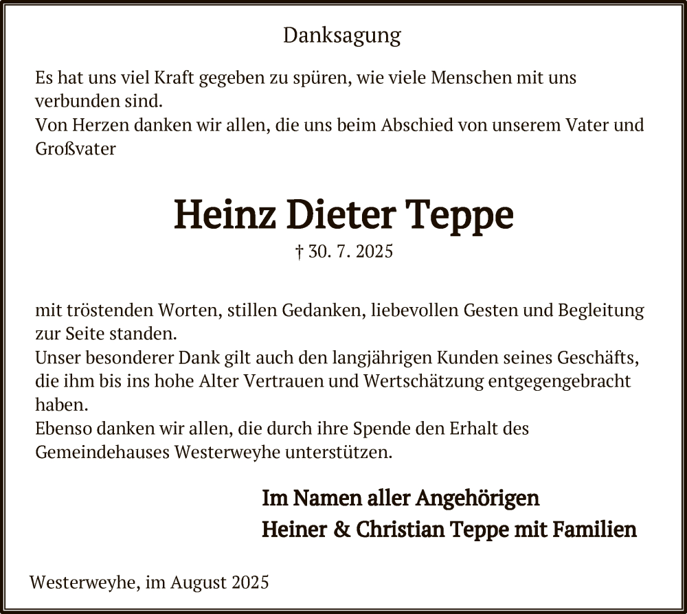 Hier finden Sie alle Traueranzeigen aus der Zeitung, die bisher für Heinz Dieter Teppe erschienen sind. Weitere Traueranzeigen, die in der Zeitung erscheinen, werden hier ebenfalls aufgelistet