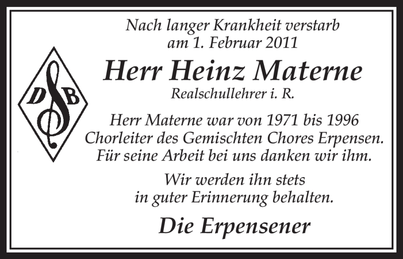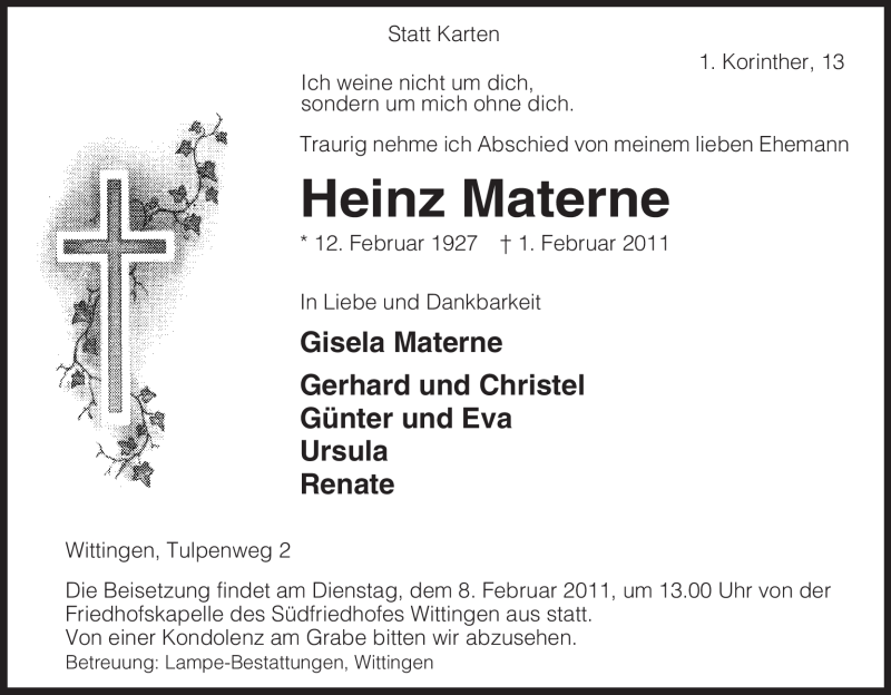 Hier finden Sie alle Traueranzeigen aus der Zeitung, die bisher für Heinz Materne erschienen sind. Weitere Traueranzeigen, die in der Zeitung erscheinen, werden hier ebenfalls aufgelistet