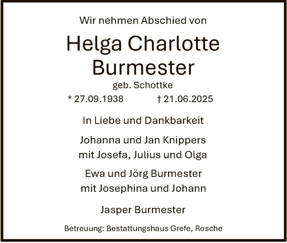 Hier finden Sie alle Traueranzeigen aus der Zeitung, die bisher für Helga Charlotte Burmester erschienen sind. Weitere Traueranzeigen, die in der Zeitung erscheinen, werden hier ebenfalls aufgelistet