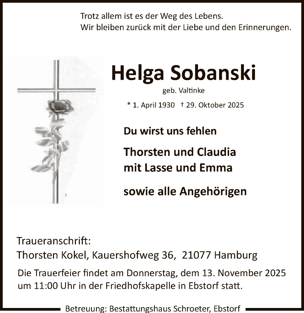 Hier finden Sie alle Traueranzeigen aus der Zeitung, die bisher für Helga Sobanski erschienen sind. Weitere Traueranzeigen, die in der Zeitung erscheinen, werden hier ebenfalls aufgelistet