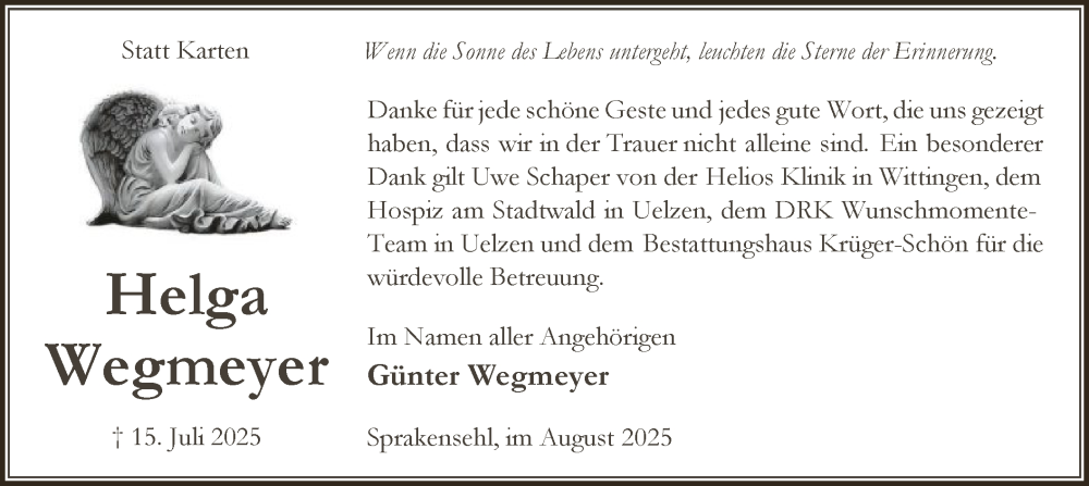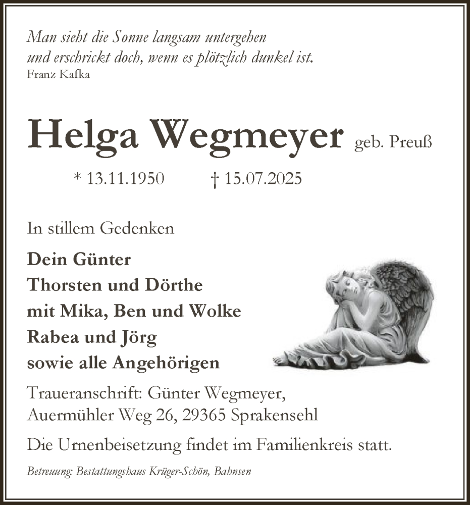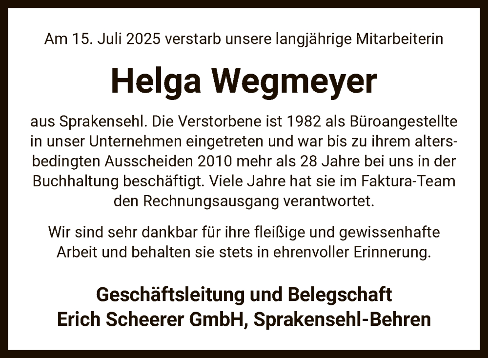 Hier finden Sie alle Traueranzeigen aus der Zeitung, die bisher für Helga Wegmeyer erschienen sind. Weitere Traueranzeigen, die in der Zeitung erscheinen, werden hier ebenfalls aufgelistet