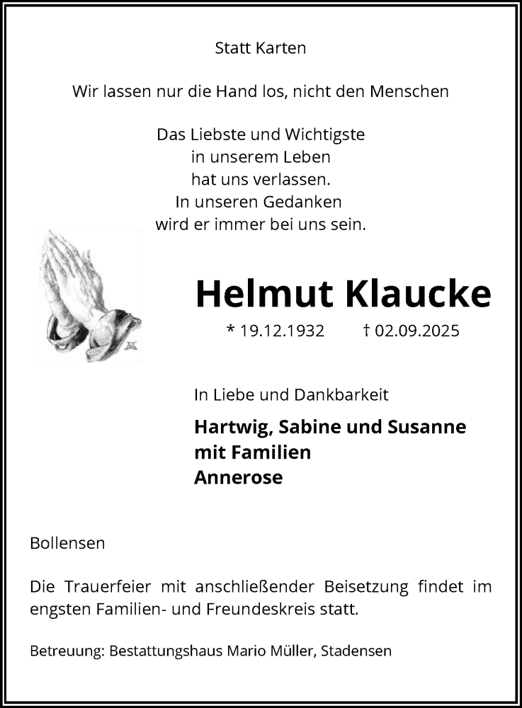 Hier finden Sie alle Traueranzeigen aus der Zeitung, die bisher für Helmut Klaucke erschienen sind. Weitere Traueranzeigen, die in der Zeitung erscheinen, werden hier ebenfalls aufgelistet